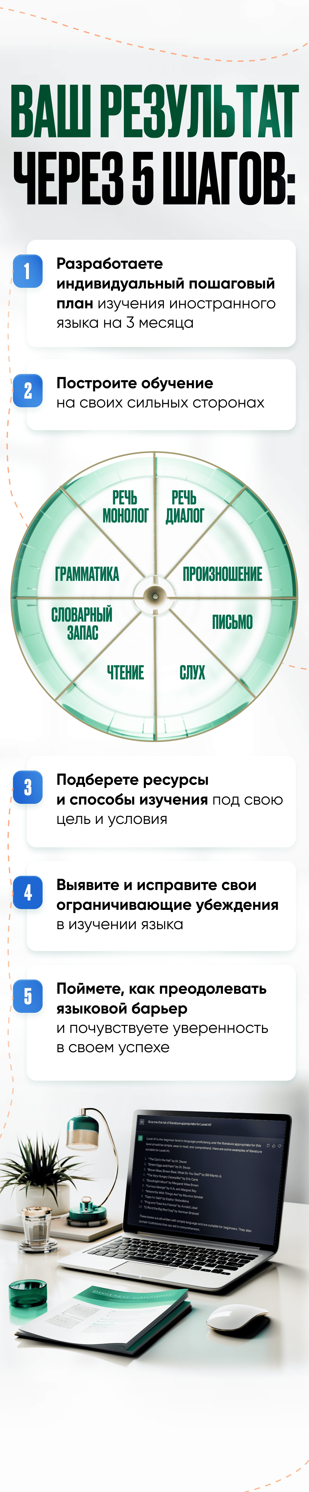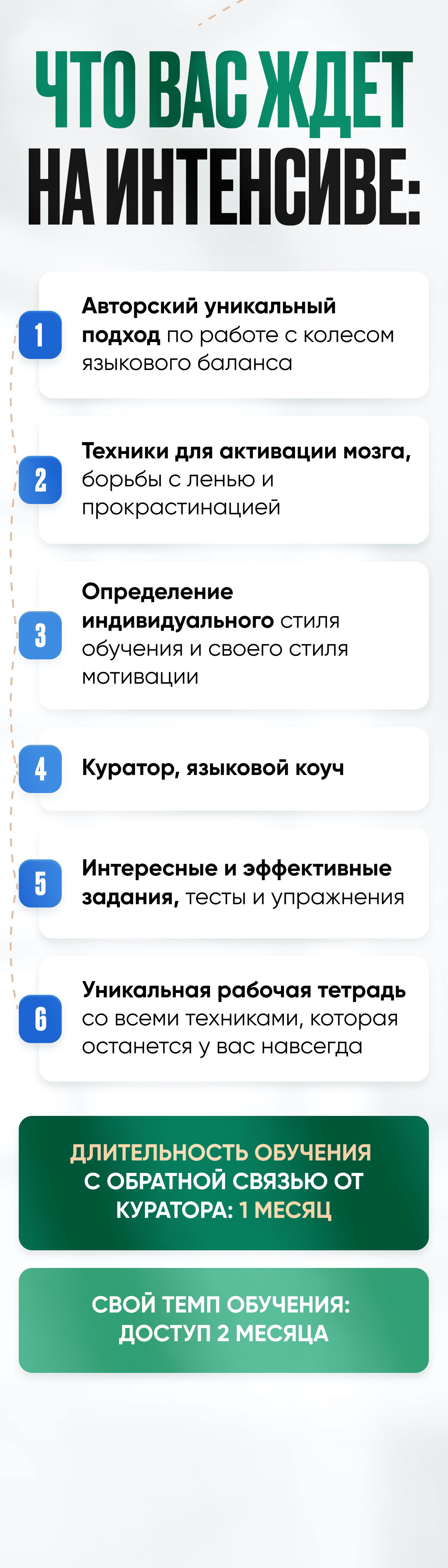 Интенсив подходит для любого уровня языка. Вы построите стратегию исходя из личных целей, условий и возможностей. А для тех, кто изучает с нуля подготовлены дополнительные рекомендации.